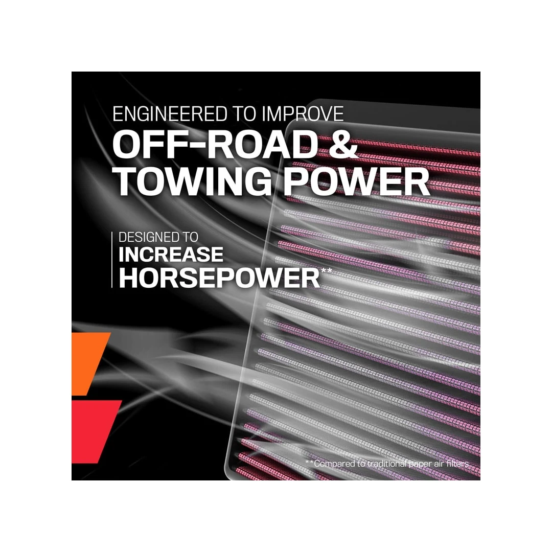 - ENGINEERED POWER: State-of-the-art air filter media is designed to increase horsepower and acceleration as well as improve overall engine performance