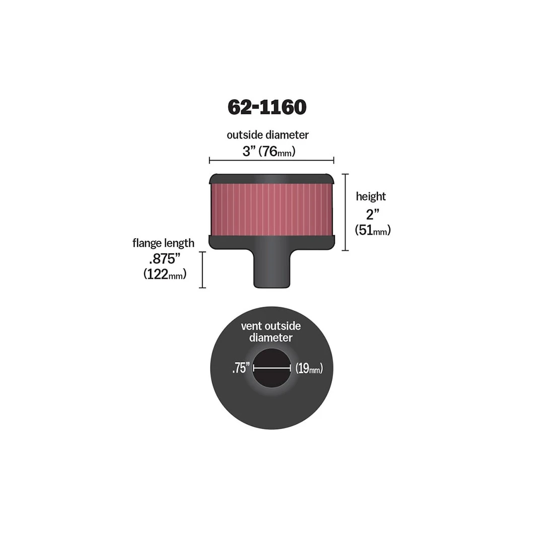 K&N crankcase vent filters are perfect for racing applications, vintage cars or individuals who want to add some aesthetics to their classic carbureted engine. The 62-1160 crankcase vent filter has a K&N embossed chrome-plated steel top and chrome-plated steel base. The 3/4 inch diameter zinc tube is designed to push in and clamp directly on to metal or plastic tubing where venting is needed. Constructed with a non-woven synthetic filter media it can be cleaned and reused repeatedly. Note: Legal in California only for racing vehicles which may never be used, registered, or licensed for use upon a highway. See knfilters.com for CARB status on each part for a specific vehicle.