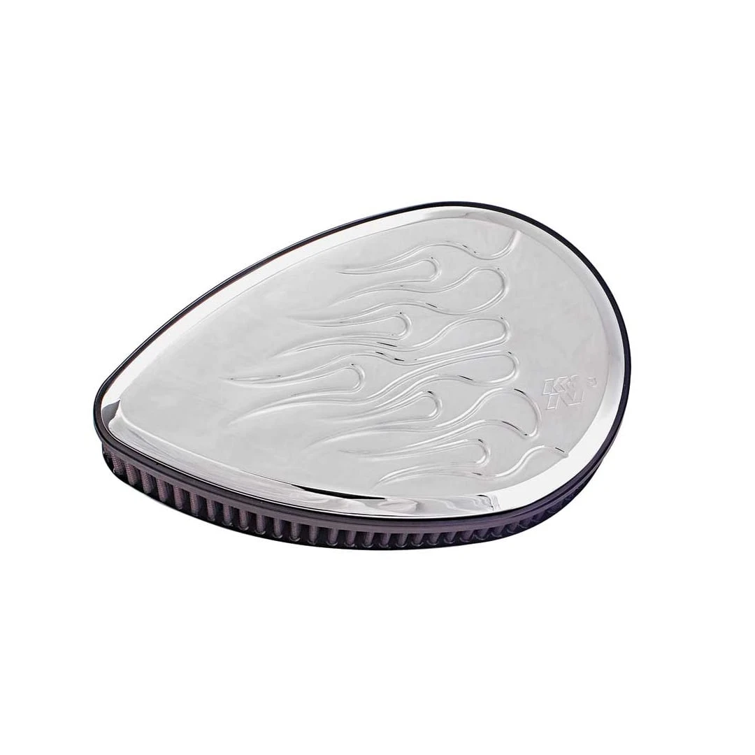 K&N air cleaner assemblies, designed for your Harley-Davidson, are a remarkable combination of performance and style. These air cleaner assemblies are made to increase horsepower and torque by supplying superior air flow. They are machined from billet aluminum, luster polished, then chrome plated to complement your show bike. This K&N custom air cleaner fits select Dyna, Softail, and Touring models. Each K&N air cleaner comes complete and ready to use including, a mounting bracket kit. There’s nothing else to buy. Installation is easy, so exceptional performance is only a few steps away with a K&N custom air cleaner. Not only that, but these parts are designed for optimal looks. This teardrop-shaped chrome covered is graced by a vintage flame design.