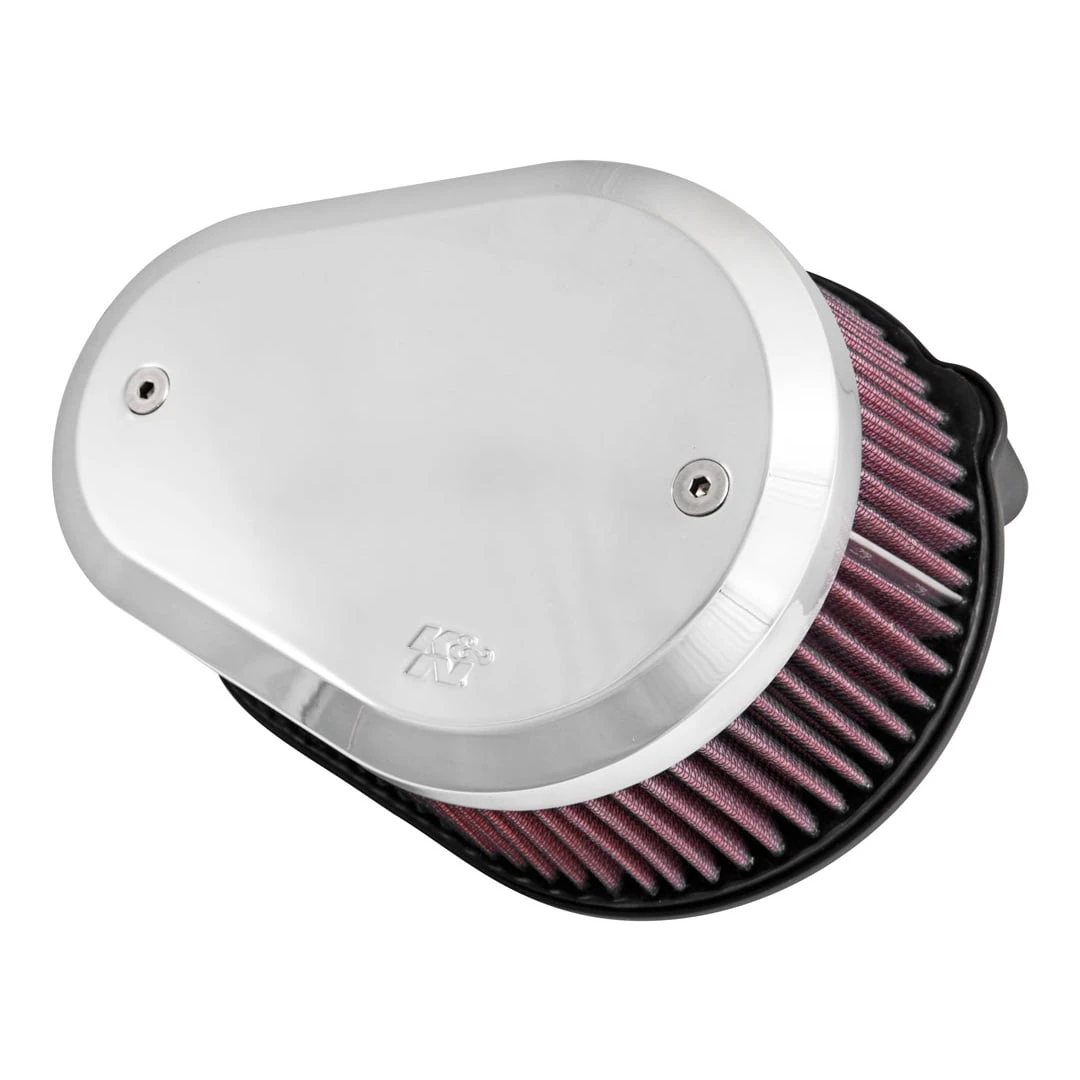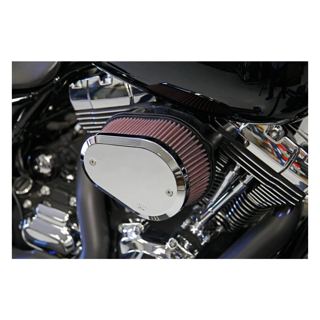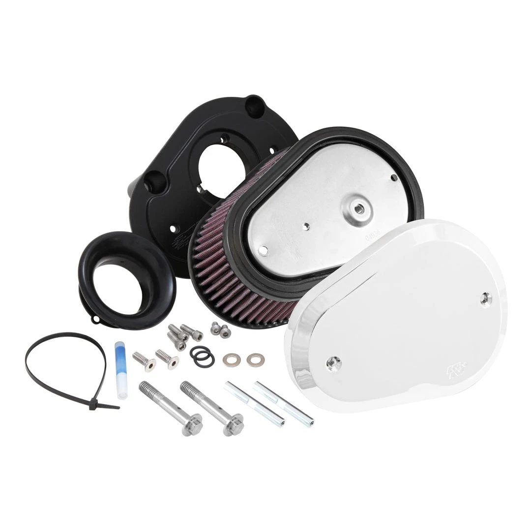 K&N’s Street Metal Series High-Flow Air Intake Systems provide attractive styling, offer increased airflow and deliver more horsepower & torque to your Harley-Davidson motorcycle. This series completely eliminates the stock OE air cleaner and replaces it with a high-flow K&N air intake system, increasing power. This intake system uses an extra tall K&N air filter, which means even more air flow and longer service intervals than standard RK-series air intake filters. Larger or custom engine builds most often benefit from higher levels of air flow, so the extra tall filter designs are a perfect choice for more powerful bikes. The K&N high-flow air filter is washable, reusable, pre-oiled and ready for installation, making an already easy install even faster. Just how fast? Less than 90 minutes, in most cases. The sturdy, custom aluminum backing plate mounts directly to the throttle body via an aluminum integrated, internal-run breather system. A durable mounting gasket is also included to help absorb vibration. The brilliant shine on this custom flare-shaped chrome cover give this air intake makes an impression on and off the road.